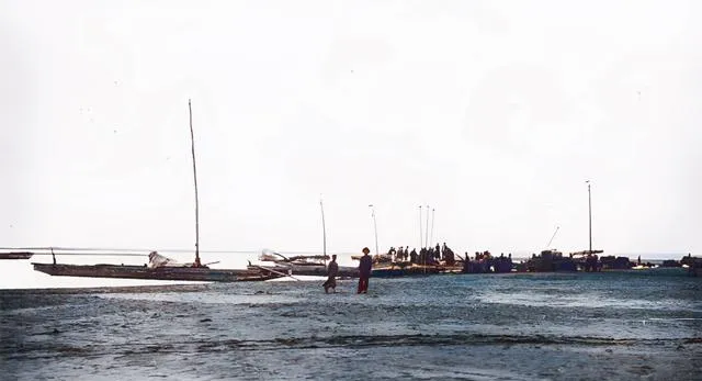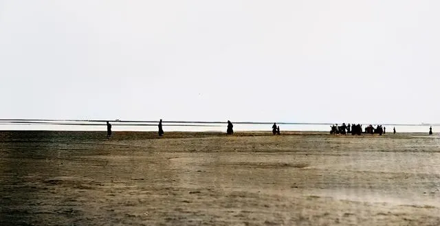 这片开阔的江滩沙粒细,远处一团黑影是赶集的人,近处有人挑担慢慢走,风把衣角吹得往后飘,脚印一路点到水边。