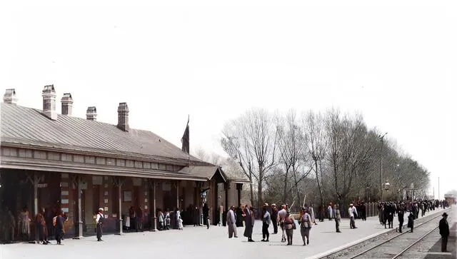 这个红砖站房叫陶赖昭站,墙角有壁炉烟囱,月台长长的,队伍排得齐,警察扛着枪来回走,爸爸指着说以前坐火车得早去占位,错过一班就耽误正事。