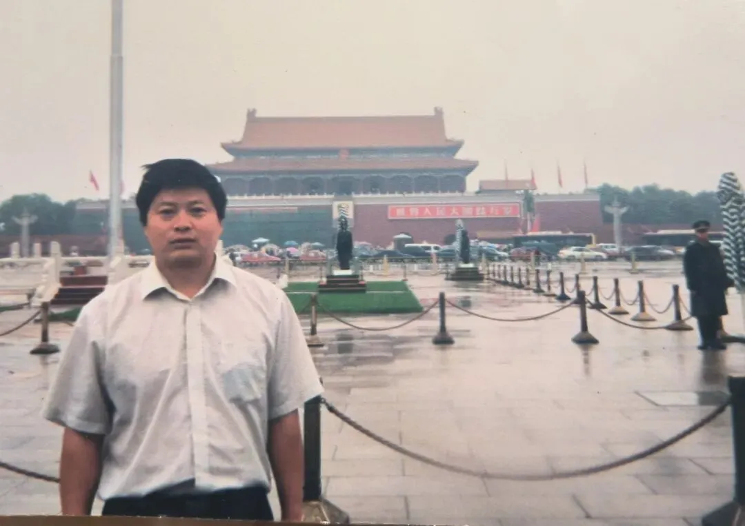 我 2004年初夏于天安门广场,时年36岁。当时下着小雨,衣服微湿,背景中的伟人画像稍显模糊,站岗的武警战士身着雨衣。