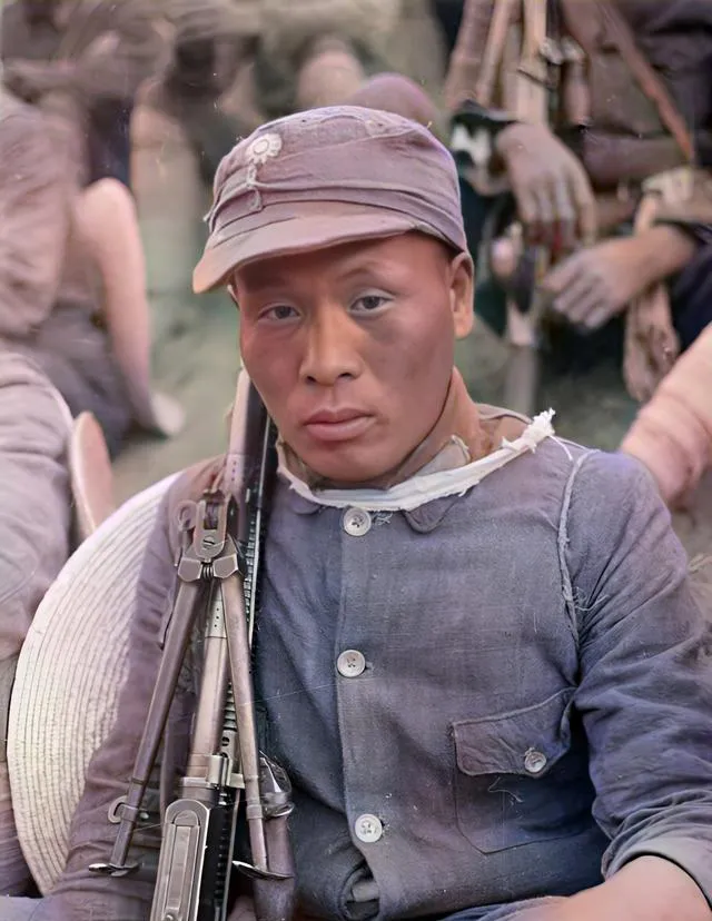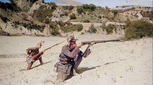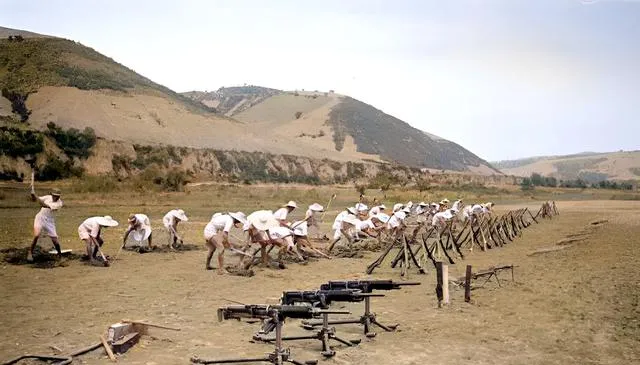 图中战士趴在坡上,枪托贴着肩膀,另一位从背后接应,帽檐压得低低的,一看就知道是真操练,训练和生产交叉进行,地头放着枪,地里有活,耳边也要听着哨声。