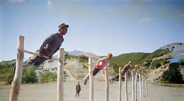 几根木桩插在土里,搭起简易单杠,战士在横杠上一翻身就稳住了,另一边有人练撑,尘土跟着人影飞,器械简陋,身子骨练得硬,这才是真正的底子。
