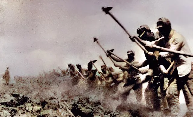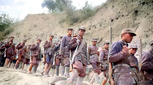 最后这一张,队伍沿着崖畔走,绑腿一圈圈勒得利索,背包挨着背包,步子整齐,尘土被踩成细粉,先辈们走过的每一步,后来人都能看见印子。