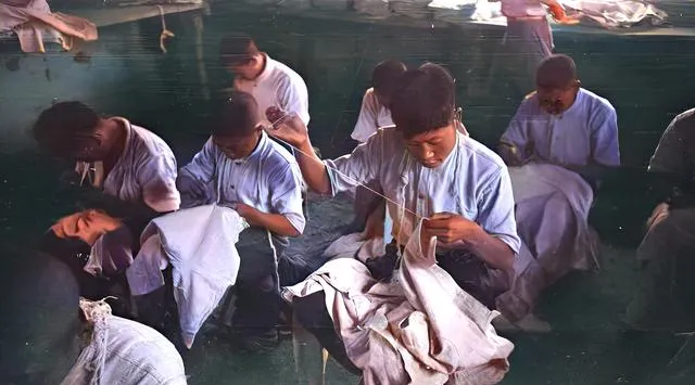 这个场景安静,大家低着头缝补,针脚一下一下往前挪,衣料粗却结实,边上放着剪刀和线团,那会儿没有多余布匹,补好了再穿,一针一线不糊弄人。