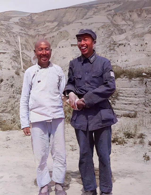 看这两位笑在一块儿,一个穿军装,一个穿粗布褂子,站在黄土坡底下,背后是密密麻麻的窑洞眼,乡亲说,人心齐了,路和田都不是难事。