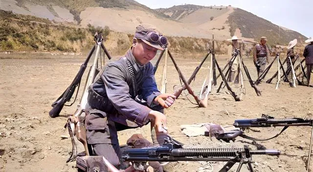 这位把护目镜推到头顶,左手托着机枪,右手拿着布条擦拭,身后步枪架排成“人”字,战斗和生产两手都要紧,枪要能响,锄也要能刨。