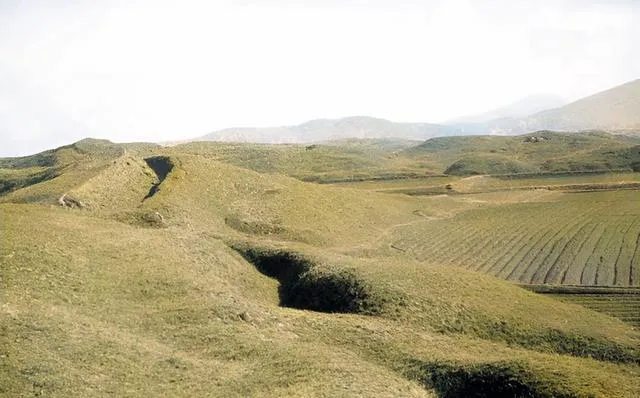 山坡被挖出一道弯又一道弯,草皮盖上去又被风掀起一点边,沟壑之下就是农田,锄头在地里翻土的声音跟远处的虫鸣混在一块儿,想想当时守城的兵就蹲在这道坎后面,心里也会打鼓吧。