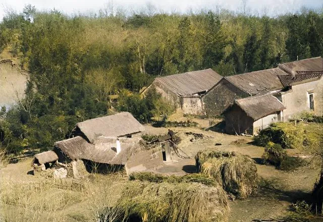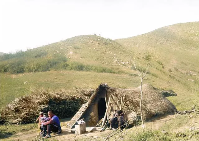 草把子一捆一捆压在屋顶,门口斜靠着几根木杆,男人抱着孩子坐在坡边晒太阳,牛就在旁边反刍,灶台搭在门口,烟直直往上走,那会儿条件苦,日子却也有章法,天晴就补屋,阴天就编篱笆,忙里偷闲还能打个盹。