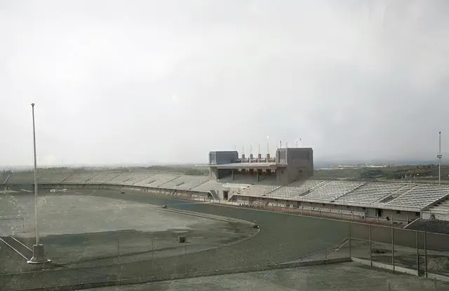 看台一圈圈层层叠起,跑道铺得宽,旗杆笔直地排在顶上,想起老报纸上写的那次全国运动会,人声浪一波接一波,场下小贩吆喝着卖茶水,拿瓷壶一提就脆响,现在球赛多了,能坐满六万人的热闹还是稀罕的。