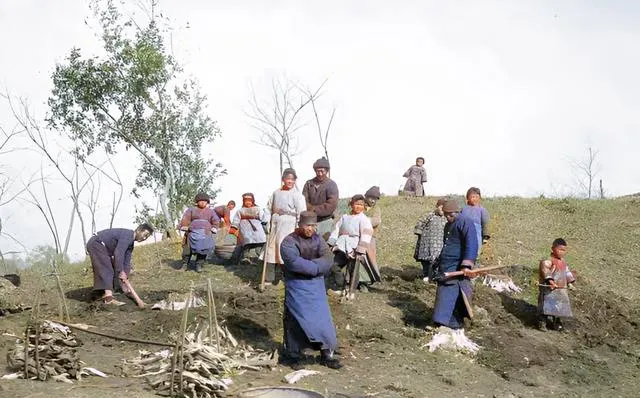 坡上人多得像开了一场集体活计,铁锹落地一下一个坑,小孩提着竹篮跟在后面拾柴,风刮脸有点疼,大家还是说笑不停,等树根劈成小块摊开晒一阵,晚上就能添到灶里,火苗一旺屋里立马暖和起来。