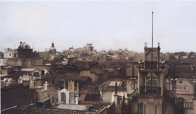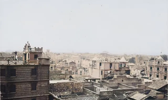 图中一片屋脊连屋脊的老南昌,灰瓦与红砖交错,屋顶探出圆顶和尖塔,像把西式的笔插进中式的笔筒里,层层叠叠望不到边,爷爷说那时候上高处一看,马头墙像一排排起伏的浪,看着就踏实。