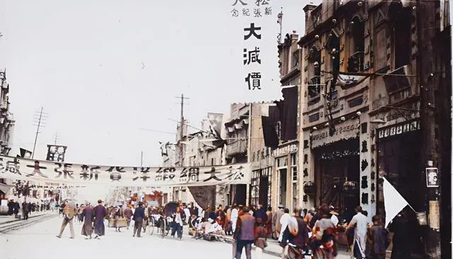 这个热闹场景叫老南昌的门面,两侧是欧式立面和招牌,横幅跨街写着大减价,路上人群、黄包车、驮货的牲口挤成一条线,脚步匆匆却不慌乱,以前街上消息靠布条和吆喝传,现在一条推送就全城都知道了。