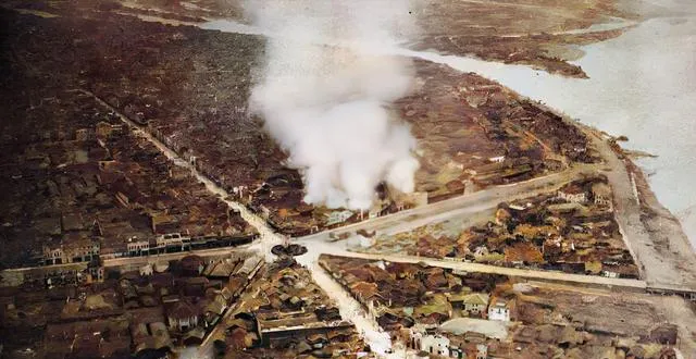 画面中央一团白烟正往上涌,四条路像被剪刀剪过,边上屋顶歪着,一枚炸弹落下去,街坊的日子就被打断,谁家锅里正滚着的米粥,谁家墙上新糊的年画,都成了灰。