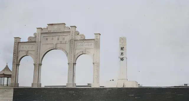 石牌坊立在台阶上,旁边是“纪忠塔”的石碑,字刻得硬朗,线条干净,阳光下泛着白,奶奶说路过这里要轻点脚步,对牺牲的人得尊重。