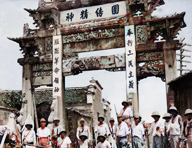 这个石牌坊雕得繁复,横额上四个大字,柱子上对联字字铿锵,一群人聚在下面,帽子歪着,枪杆子亮着,拍照那刻是笑的,转身就各奔命运去了。