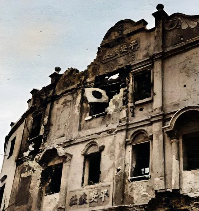 这栋楼的檐口还优雅着,窗洞却黑得发空,砖角被掀起,墙面像被猛兽抓过,扯下一片皮,牌匾上“平安”两个字还在,像是命运开的冷玩笑。
