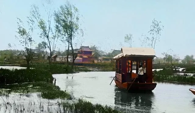 图中小船篷子是米色的,船尾撑着竹篙,水面开出一条亮亮的缝,小时候第一次坐游船,我还紧着抓栏杆,父亲说,别怕,湖里的风是软的,果然顺着脸吹过来,就只剩惬意了。