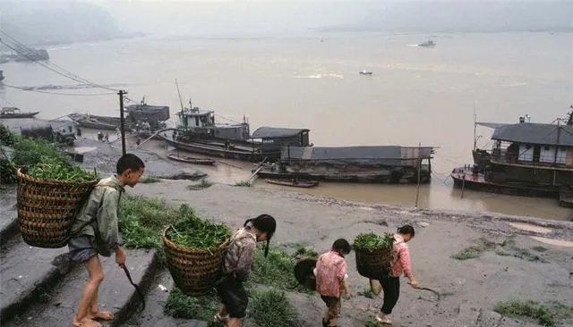这几位小伙伴背着大竹篓,从湿滑的台阶往上走,篓里是一捆捆新鲜的猪草,脚边的淤泥带着水光,江面上停着木船和铁船,爷爷说,暑假里小孩子就这样帮家里干活,草湿重,肩膀勒得生疼也不喊累,等渡船靠岸,吆喝一声就上船回家了,现在放假大多是补课和游学,挑担的日子少了。