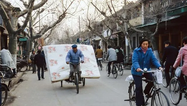 这个大家伙是老式弹簧床垫,花朵布面外套鼓鼓的,车把上缠着麻绳固定住,师傅踩着二八大杠走得稳稳的,街上都是自行车流,喇叭一按叭叭响,行人让一让就过去了,现在搬家打一车就行,以前一车一趟,慢慢搬也不焦躁。