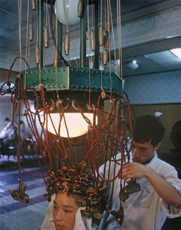 这个铁家伙可厉害,顶上圆盘挂了密密的线坠,夹子一只只扣在发丝上,灯泡亮得发烫,师傅穿白大褂手上不停,顾客脖子上围着毛巾,脸上认真又期待,妈妈笑说那时烫完得竖着睡一晚,第二天一出门就精神咯。