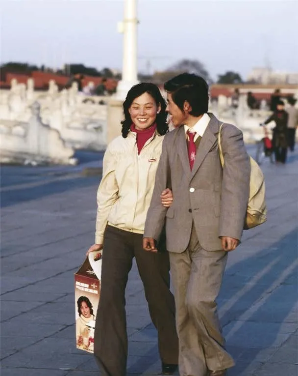 两位青年挽着胳膊走过广场,男生穿灰色西装配红领带,女生风衣领口翻着,提着礼盒,笑得真,八十年代的恋爱讲究情投意合三个字,不讲排场也不比谁的条件,能一起走路聊天就是过日子的样子。