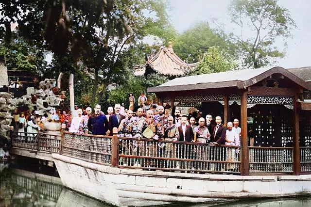这个木架船边的合影很讲究站位,前排官员正中并列,外宾穿深色西装靠边站,桥栏是细密的木格子,大家神情克制却藏不住兴奋,宴后游园一趟,照个相带回去才算圆满。