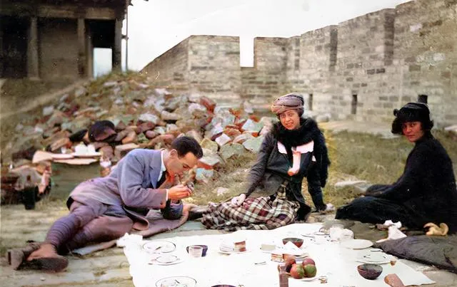 这个白布一铺就开吃的场景可妙,盘子杯碟一字摊开,男子点着烟斗,女子拎着酒杯,旁边砖瓦堆得乱却不影响胃口,他们把城墙当后花园,守墙的看守杵在边上也不吱声。