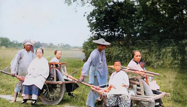 这车前细后宽,轮子一只却跑得稳,车夫戴草帽身子往前探,手心满是茧,坐车的人神色端着,城郊之间全靠这玩意儿周转,爷爷说给钱按段算,喊到哪儿就拉到哪儿。