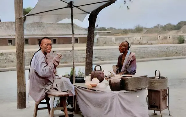 这个茶摊简单得很,木桌两条凳,壶嘴冒着白气,男人端碗抿一口,眼里光亮了些,摊主笑说解渴不贵,走远了再来,小时候跟爸爸赶集,最盼的就是在这种摊上歇一会儿。