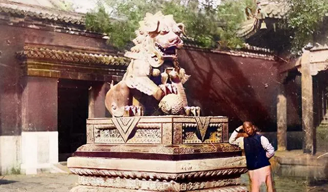 这个男子右胳膊搭在石座上,手托着腮,左手藏在背后,姿势妖娆,狮子趴在台座上踩珠子,琉璃瓦压着屋檐闪一丝光,他看上去很会摆,照片也就有了戏。