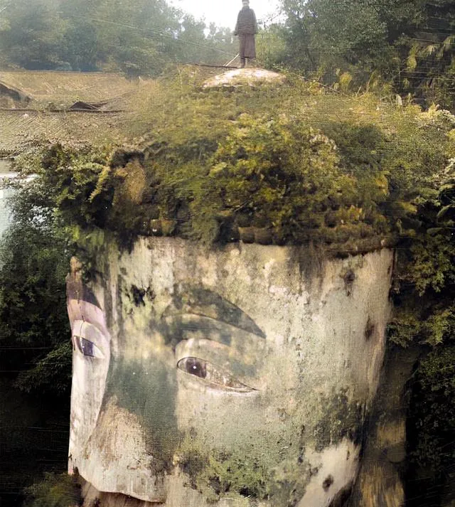 这张最稀奇,游客站到了大佛头顶,肉髻上杂草一片,眉眼仍安静,鼻梁边还长着一簇灌木,下面江水绕着脚边去,过去游客少,草就敢往上长,现在修护勤快,看不到这个模样了。