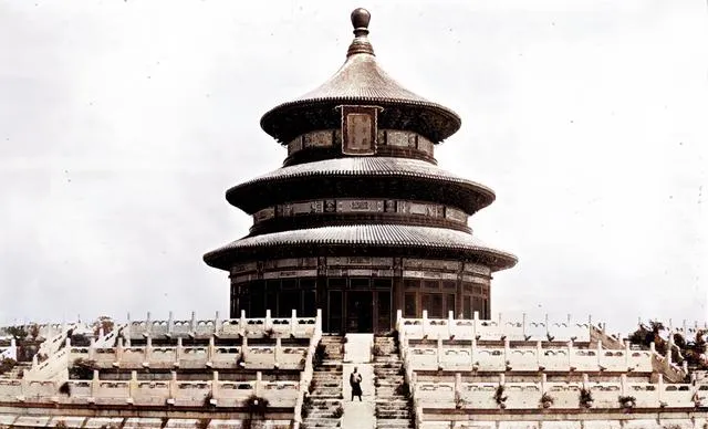 祈年殿正中立着,台基一层层往上叠,御道两侧草从石缝里冒出来,一个人站在台阶中央,显得渺小,风在空场里打圈,声音空得很。