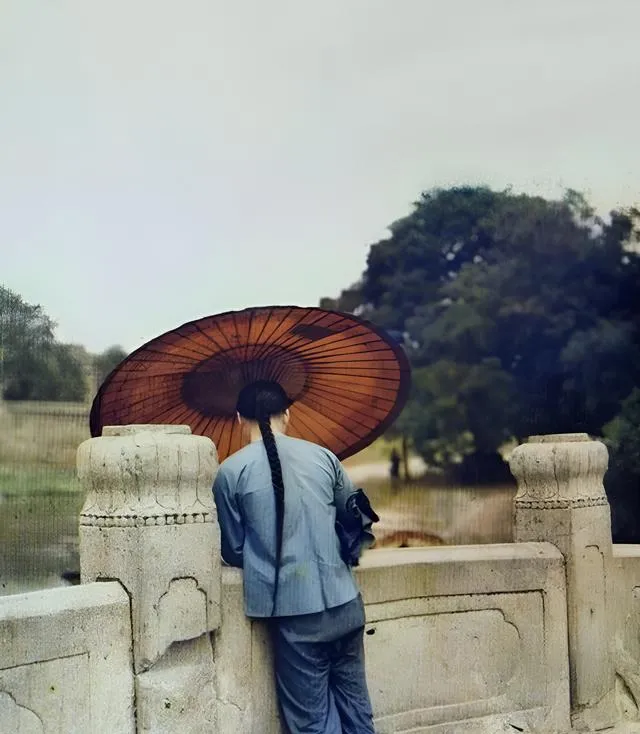 这个背影好看,伞面一摊暖橙,雨不大却很密,水滴打在河心泛开一圈又一圈,他靠着望柱发呆,衣摆被风吹起一点点,那会儿没有手机,人就把心思交给了雨。
