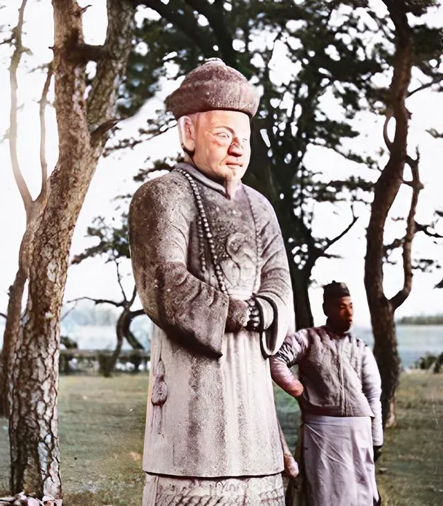 这尊官员模样的石像生站得端,珠串挂胸前,朝服纹路还看得清,一个男子在旁边叉腰凹个造型,风从松林里穿过,落在衣角上就不动了,这一刻古今同框,还挺有趣。