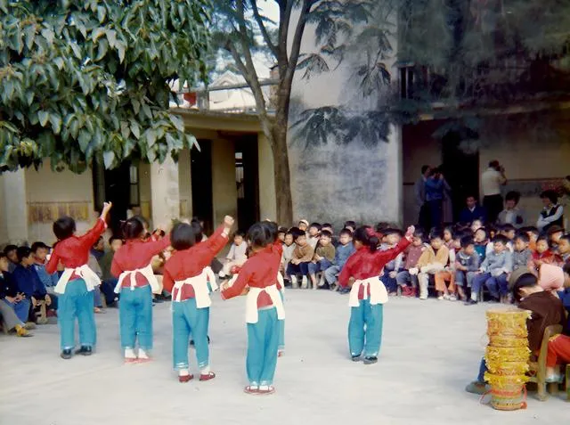 图中孩子们穿着红上衣蓝裤子,手里举着小花篮,外面的客人站在一圈看,老师在旁边招呼,奶奶说,那时候学校的操场就是全村的舞台,逢人来就表演,鼓点一响,小鞋子跟着地面跳。