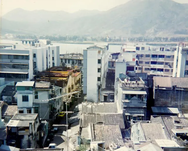 站在高处俯拍,屋顶层层叠叠,有平顶也有瓦顶,远山像一条暗色的背影,楼顶竖着鱼骨天线,密密插在天边,那时的深圳看上去像个小县城,可街巷里已经藏着要变的劲头。