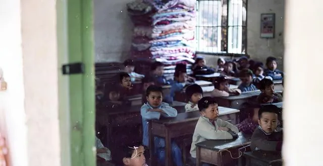 这个教室后墙堆了一座花花的被褥山,孩子们两人一桌坐得端正,窗棂上透着一点风,老师说,没寝室就晚上铺在桌上,白天再收起来,简单却有秩序,日子就是这么过出来的。