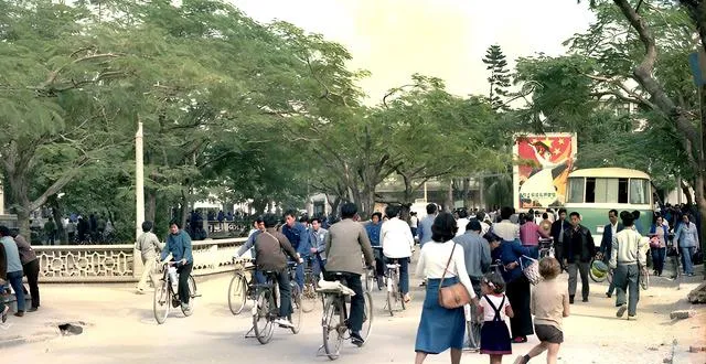 堤边风景不错,绿皮公交停在树影里,路旁宣传画色彩很鲜,骑车人一路向前,孩子跟在大人身后小跑,城市像刚醒来的样子,伸个懒腰就要长个儿。
