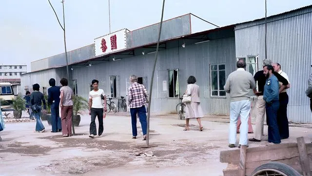 镜头往近处推,一个外宾站在牌下,身后靠着几辆自行车,门框被手指摸得发亮,照片像留下一枚路标,提醒我们这片地也曾简陋过。