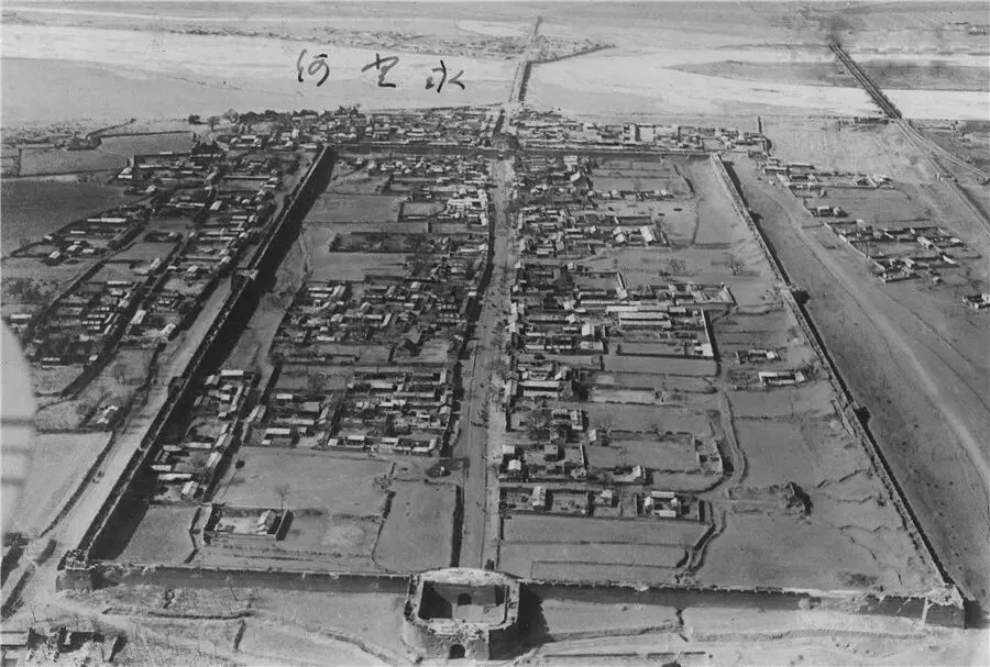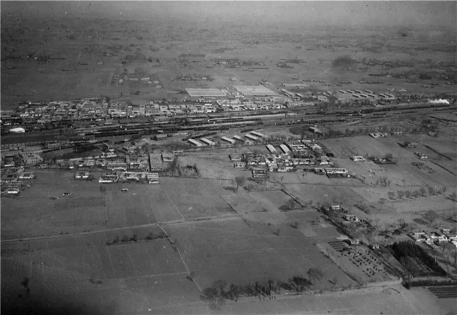 从空中俯瞰丰台,那时候还只是个小县城。火车站上停着几列货车,铁道两旁是密密麻麻的民房,城外一片庄稼地。