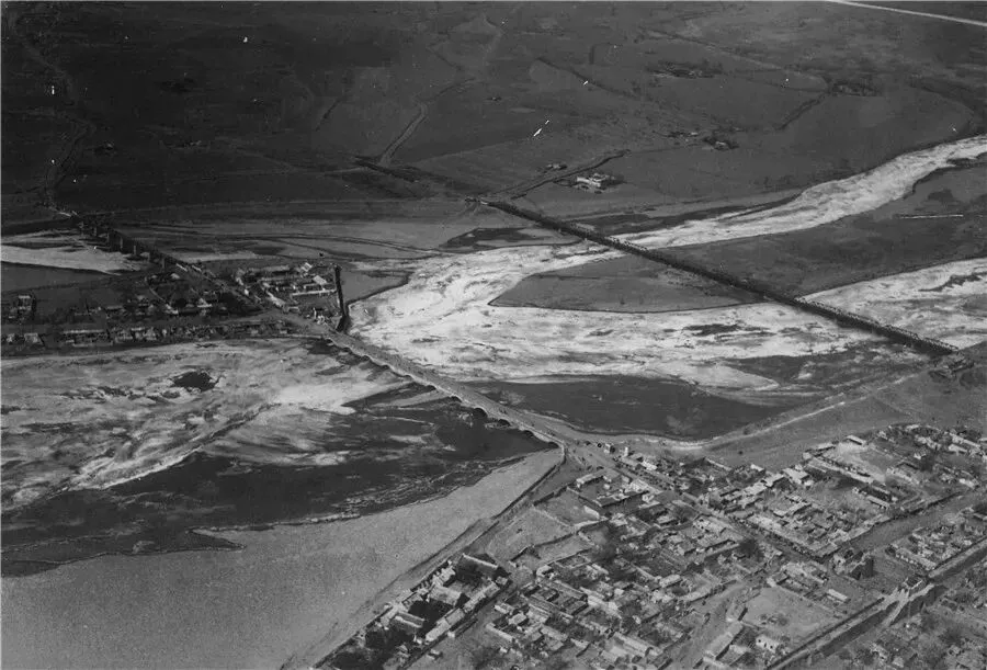 从高空俯瞰宛平城,城墙还算完整,城中一条大路直通城门外的永定河。卢沟桥就横卧在河面上。
