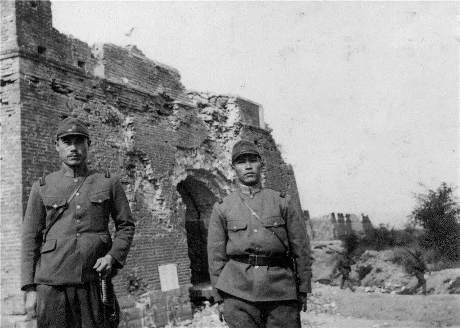 这张照片里,德田少佐手握军刀,和另一个日军站在宛平城东门前。城门楼子已经被炮火打得千疮百孔,满是弹痕。