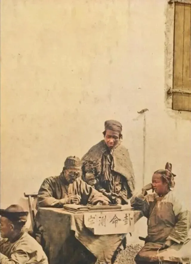 图中桌上一摞薄册子,一个写字板,一张写着字的布条,这个小摆设就是街口的卦摊,竹椅歪着靠墙,师傅低头写写画画,旁边人掰着手指头问个前程,墙上窗扇半掩,风一吹纸角抖两下,听老人说,算卦不一定灵,灵的是让人心里有个落点,赶集的人停一脚,多半是求个安心。