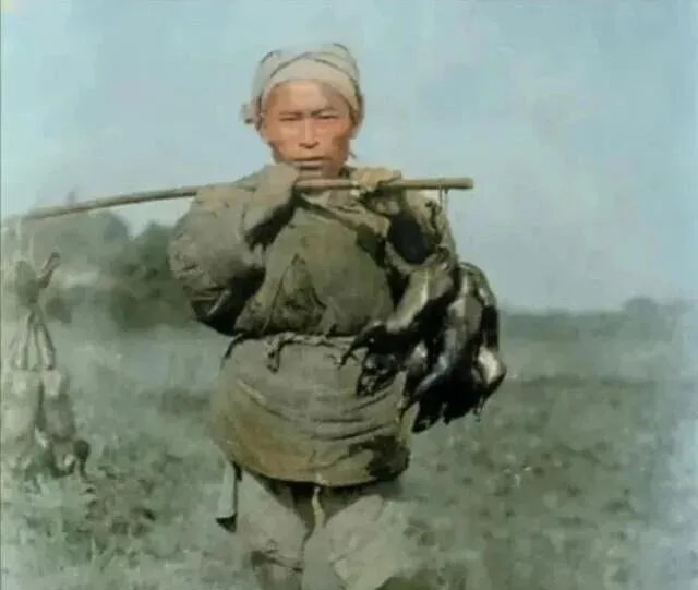图中肩上的细竹竿叫扁担,右端挂着几只野物,衣服上全是草籽,裤腿扎着绑腿,走在田埂上不急不慢,奶奶说,打到啥吃啥,灶里有火就是好日子,现在冰箱一打开啥都有,以前得靠脚板子跑。