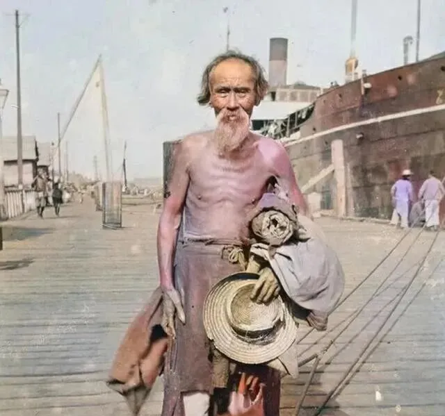 这个男人胳膊被太阳晒得发紫,手里捏着草帽,腰间塞着一块旧布,靠船的木板道上,索具拉得笔直,他背后是黑压压的船身,像座墙,码头活累,可一天结束摸摸口袋里那点工钱,也能买碗热汤面,有汗才有饭。