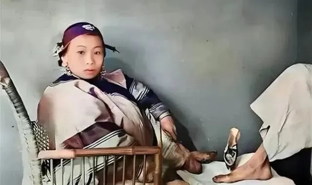 图中这位坐在竹椅上,脚尖尖翘,绷带从脚背绕到脚踝,鞋尖像小船,旁边摆着绣花的小鞋,那时候叫三寸金莲,漂亮是漂亮,路却走不稳,外婆叹气说,美有时候要命,幸好后来这事儿慢慢停了。