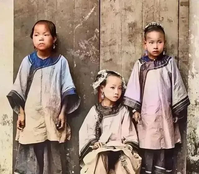 这三个小丫头,头上簪着银花,衣服是宽大的棉布褂子,领口滚着深色边,裙摆处有补线,站的那个抬头望,坐着的手里捏着绳穗,干净里透着节省,过年拍一张照能讲好多年。