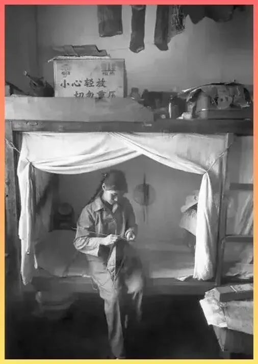 这应.该是那时候的集体宿.舍或者简.陋的家。一张简单的架子床,挂着白布帘子,.上面堆着印有小心.轻放的.纸箱子。虽然居住环境逼仄,但那份在.灯下缝补衣物的宁静,却透着一种把.苦日.子嚼出甜味儿的韧劲。