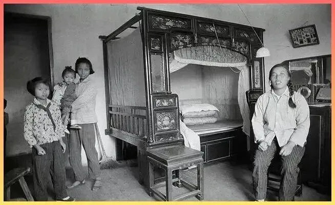 最.后这两张,是那时.候.的家庭内景和街头景象。古色古香的架子床,一家几.口虽.显拥挤却温馨;城墙下.的行人,虽然衣着单调,但步伐坚定。