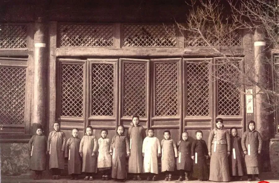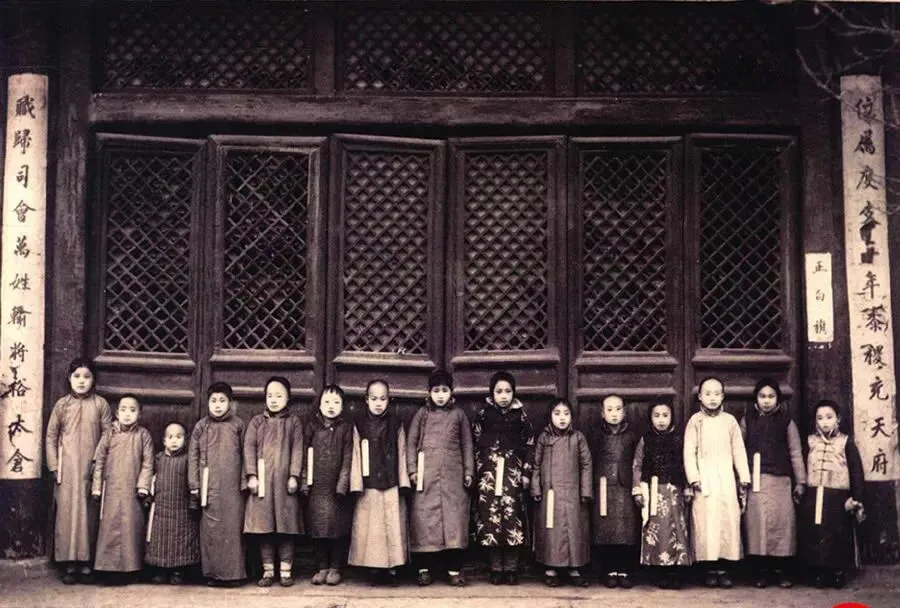 图中这排站着的叫秀女,门板高大,格扇厚重,姑娘们身上多是深色袍褂,袖口与下摆露出棉絮的鼓胀感,脚下棉靴笨笨的,个头一高一矮却都把背挺直,胸前别着长条名签,等内务官点名就往里走,摄影机刚传进京城那会儿,能留下这样一张影,算是难得的记录了.