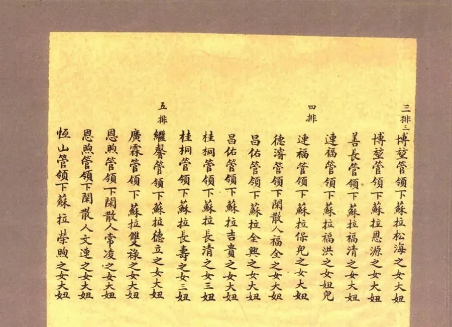 这页名字更密,旗名挨着人名排,称呼里常见“大妞”“二妞”这样的叫法,读着像家常,其实都是正经登记,爷爷看过这页笑说,**“名儿不响,门第要响.”**意思就是看重出身门第多过花容月貌.